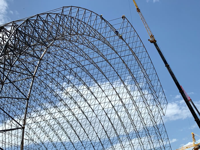 (2)网架加工前应对现场尺寸进行复测,确认无误后方可进行加工、安装;网架制作、运输、安装应遵守《空间网格结构技术规程》JGJ7-2010、《钢网架宿迁螺栓球节点》JG/T 10-2009、《钢网架宿迁螺栓球节点用高强度螺栓》 GB/T 16939-2016、《宿迁钢结构宿迁工程宿迁施工规范》 GB50755-2012、《宿迁钢结构宿迁工程施工质量验收标准》 GB50205-2020。